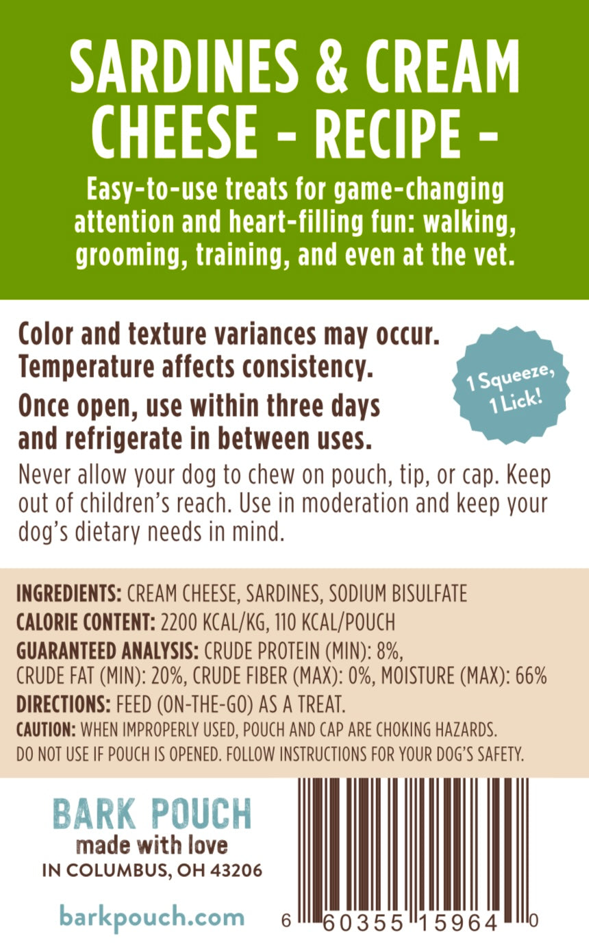 Delicious cream cheese and wild-caught, sustainably sourced tasty sardines create this super enticing recipe in our easy-to-use pouch—great for dogs who often refuse treats in distracting settings.